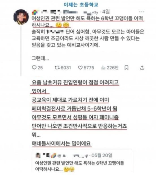 한 초등학교 예비 교사가 SNS에 "여성인권 관련 발언만 해도 욕하는 6학년 남학생들이 있다"고 하소연한 글이 화제가 됐다.