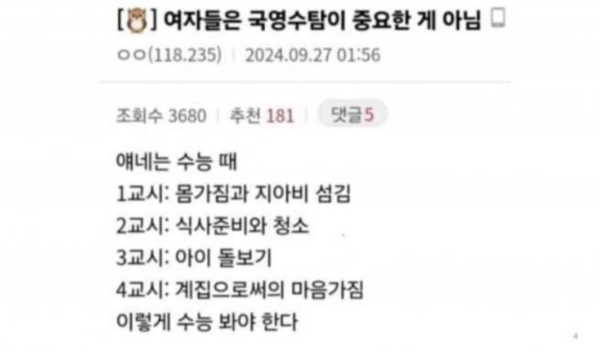 또 다른 학생은 "수업 시간에 남학생들이 '남존여비'가 맞다며 여자애들은 집에서 밥이나 해야 한다고 말했다"고 털어놨다.