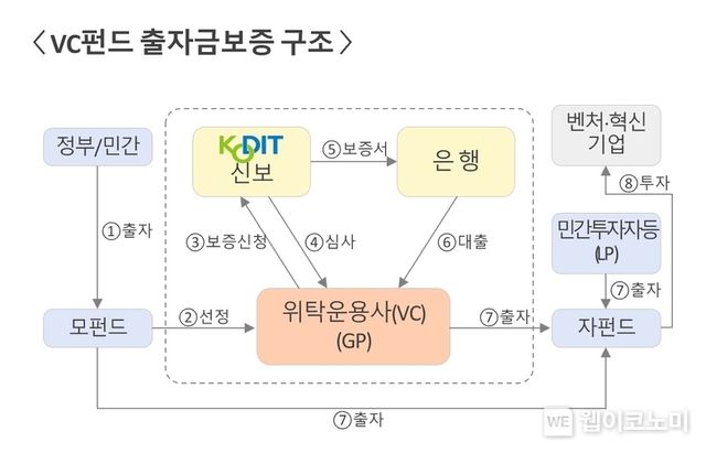 VC보증은 투자시장 위축으로 벤처펀드 조성에 어려움을 겪는 벤처캐피탈(VC)을 지원하기 위해 도입됐다. 신보는 한국성장금융투자운용, 한국벤처투자의 자펀드 위탁운용사로 선정된 벤처캐피탈이 자펀드 결성에 필요한 출자금을 마련할 수 있도록 최대 50억원까지 보증을 지원한다.
