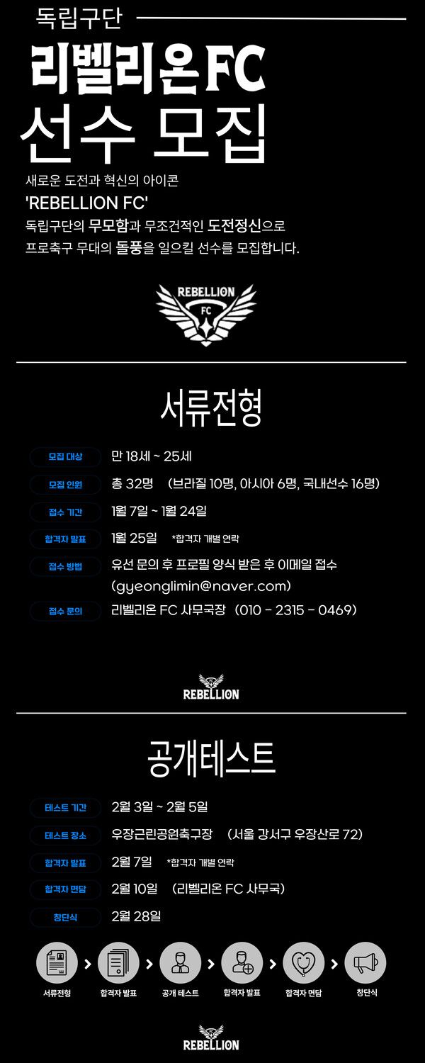 [풋볼리스트] 김동환 기자= 독립구단 리벨리온FC가 선수 공개 모집을 실시한다. ‘도전과 혁신의 아이콘’이란 슬로건으로 구단의 독립성과 혁신적인 정신을 강조하며, 기존의 틀을 깨고 새로운 길에 개척하겠다는 의지를 담는다.