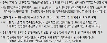 이를 위해 ▲고가 약제비 부담 경감을 위한 의약품 보장성 강화 ▲소아, 장애인 등 취약계층 보장성 강화 ▲산정특례 대상질환 확대 등 의료사각지대 해소에 2024년 12월 기준 약 1조 4500억 원의 건강보험 재정을 투입했다.