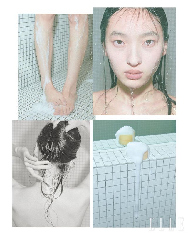 치약을 듬뿍 묻힌 칫솔로 입 안 구석구석 ‘쓱싹쓱싹’ 양치질해 본다. 양치를 하며 목욕탕 선반에 놓인 알록달록한 목욕 바구니를 구경하는 재미도 쏠쏠! 깨끗한 피부가 돋보이는 모델의 피부는 Bobbi Brown 인텐시브 세럼 파운데이션 SPF 40/PA⁺⁺⁺⁺, 아이보리를 얇게 얹어준 후 두 뺨과 눈두덩, 콧잔등에 Chanel N°1 DE CHANEL 레드 까멜리아 립 앤 치크 밤, 6 베리 부스트를 터치해 혈색을 더했다. 입술에는 내추럴한 로즈 베이지빛의 Dior Beauty 디올 어딕트 립 글로우, 012 로즈우드를 옅게 발색했다. 마지막으로 가볍게 컬링한 속눈썹에 투명한 M·A·C 프로 락드 브로우 젤, 클리어를 꼼꼼하게 칠해 주면 룩 완성이다.
