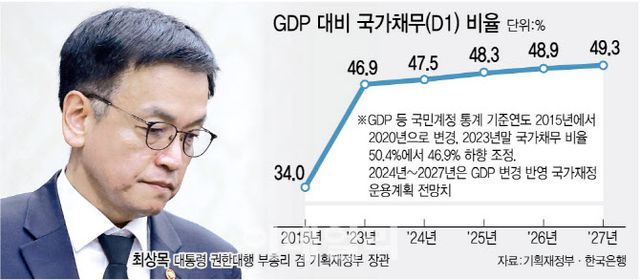 나이스신용평가에 따르면 2015년과 2016년 GDP 대비 부채비율은 국가재정법상 국가채무(D1) 기준 34%대였으나 2019년 이후 지속적으로 상승해 2023년말 기준 46.9%까지 올랐다.