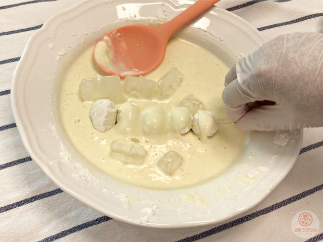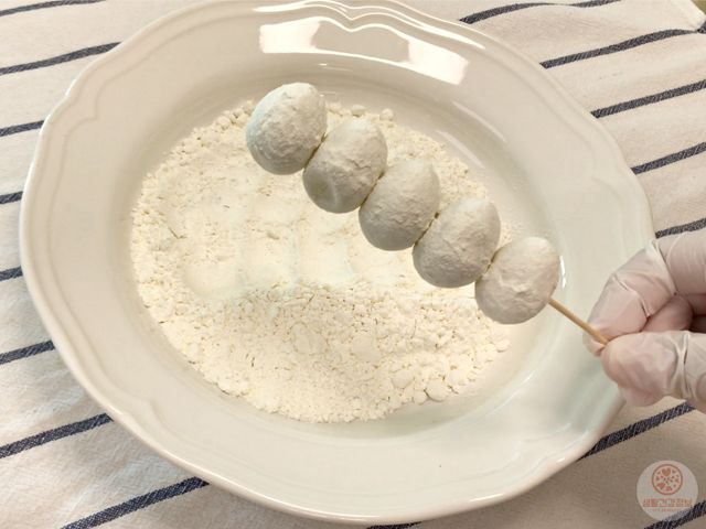 튀김옷이 분리되지 않도록 밑작업을 해요.