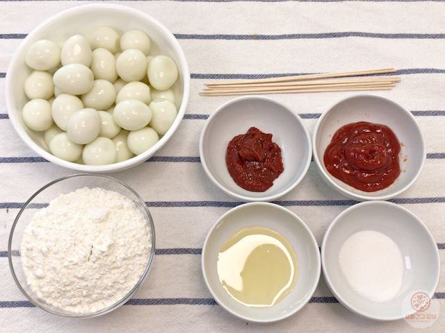 재료는 메추리알, 튀김가루, 고추장, 케찹,