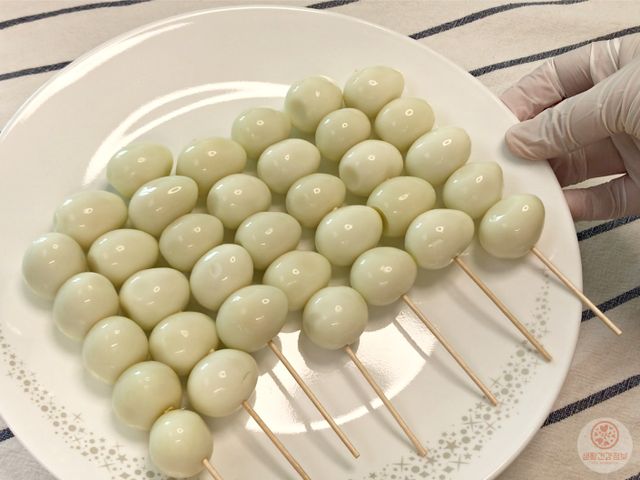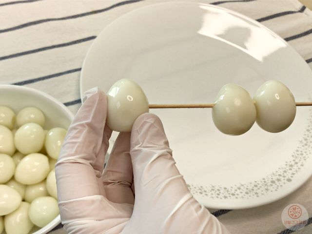 삶아서 껍질 벗긴 메추리알을 꼬치에 끼워주세요.