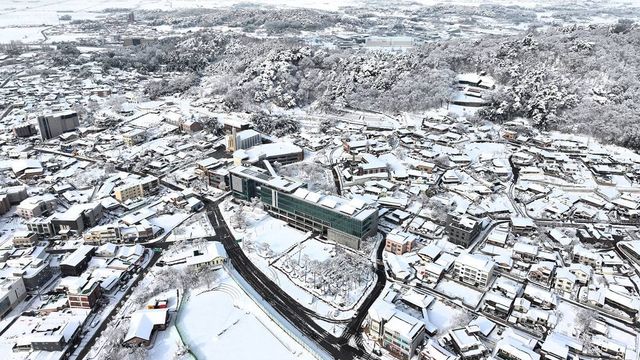 사진은 하늘에서 본 눈 쌓인 부안읍 시가지 전경 / 뉴스1(부안군 최광배 주무관 드론사진 제공)