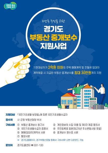 2020년 1월부터 시행된 경기도 부동산 중개보수 지원사업은 도내 국민기초생활수급자를 대상으로 거래가격 2억 원 이하 주택 매매 및 전·월세 계약 시 지불한 중개수수료를 최대 30만 원까지 지원하는 제도다.