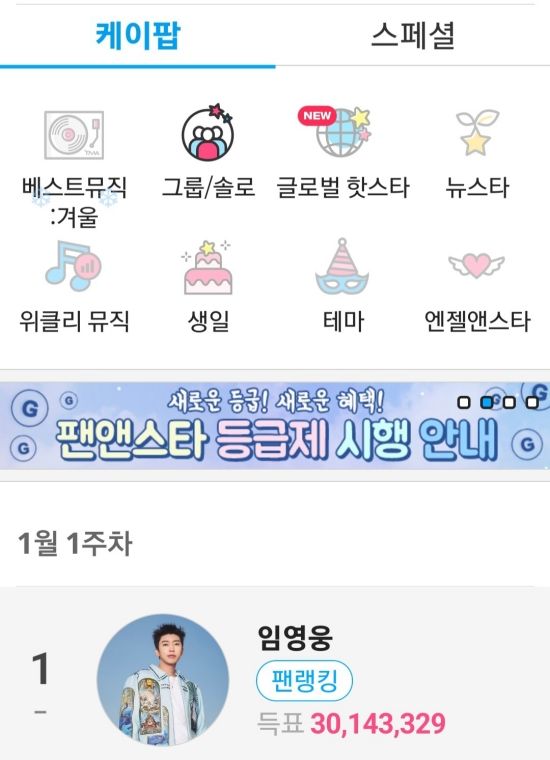 최근 '팬앤스타'에 따르면, 임영웅은 1월 1주 차 솔로가수 인기 랭킹 투표에서 1위에 등극했다.