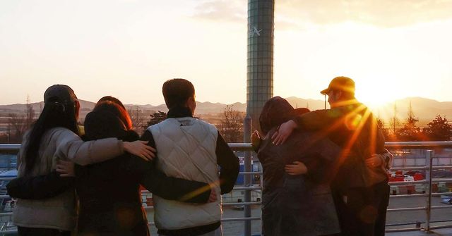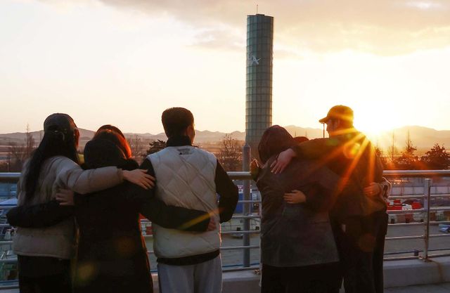 새해 첫날인 1일 오전 전남 무안국제공항에서 제주항공 여객기 참사 유가족들이 서로 감싸 안고 일출을 보고 있다. / 뉴스1