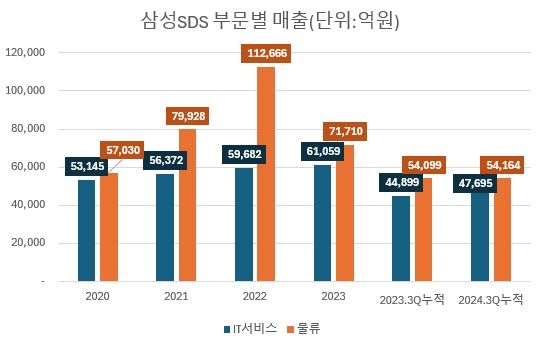 물류사업 매출이 정체된 영향이다. 물류사업 매출은 지난해 3분기누적 5조4164억원으로 전년 동기(5조4099억원)에 비해 0.1% 늘어나는데 그쳤다. 이어 2023년 매출(7조1710억원)은 전년(11조2666억원) 대비 36.4% 급감했다.