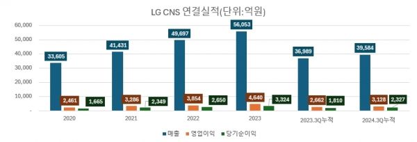 LG CNS는 2023년 매출(5조6053억원)이 전년(4조9697억원)보다 12.8% 늘었다. 2020~2023년 3년 연평균 매출증가율은 18.7%다. 지난해 3분기누적 매출도 전년 동기 대비 7% 증가해 양호한 성장성을 유지하고 있다. 그리고 지난해 3분기누적 매출에서 내부거래(2조4714억원)가 차지하는 비중은 62.4%로 삼성SDS(79.9%) 대비 17.5%포인트 낮다.