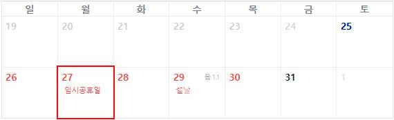 설 연휴(28~30일) 전날인 27일을 공휴일로 지정하게 되면 주말인 25일부터 30일까지 총 6일간의 연휴가 만들어진다. 임시공휴일 지정은 추후 국무회의 의결을 통해 최종 확정될 전망이다.