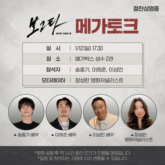 오는 12일 오후 5시 30분, 메가박스 성수에서 송중기, 이희준, 이성민 배우가 함께하는 메가토크가 진행된다. 영화 저널리스트 장성란이 모더레이터로 진행하는 이번 메가토크는 끊임없는 도전으로 연기 스펙트럼을 무한히 확장시키며 관객들에게 뜨거운 사랑을 받고 있는 세 사람이 만나 다채로운 이야기를 나눌 예정이다.