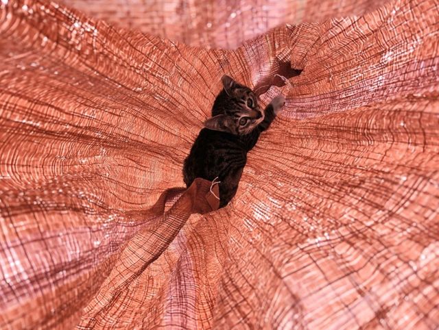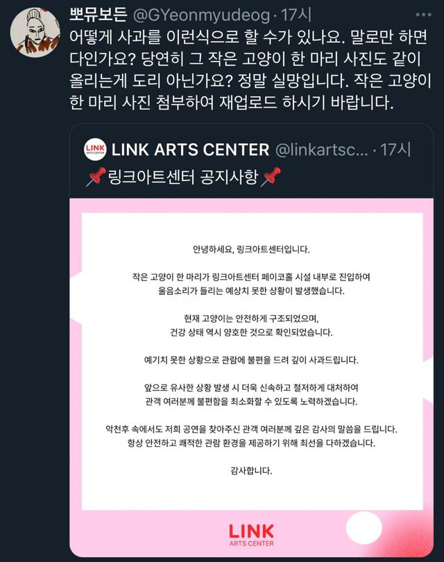 관람 도중 작은 고양이 한마리가 시설에 들어와 울음소리가 들림