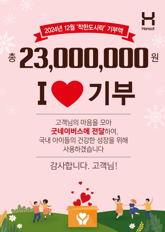 [프라임경제] 한솥도시락이 지난달 진행한 '착한도시락' 기부 행사를 통해 모인 적립금 총 2300만원을 글로벌 아동권리 전문 NGO 굿네이버스에 기부했다. 현재까지 '착한도시락' 기부행사를 통해 모인 총 금액은 약 1억6700만원이다.