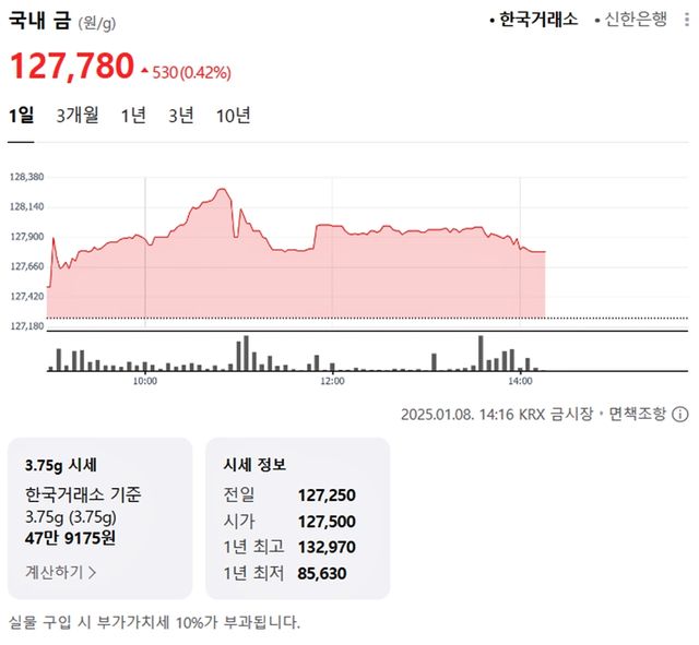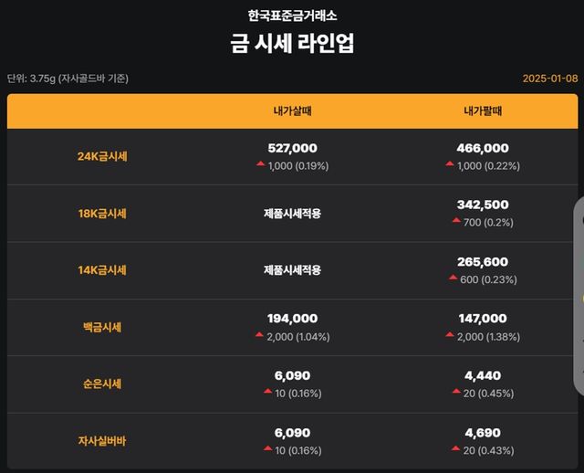 국내 금시세(금값)가 8일 오후 상승세(전 거래일 대비)를 보이고 있다.