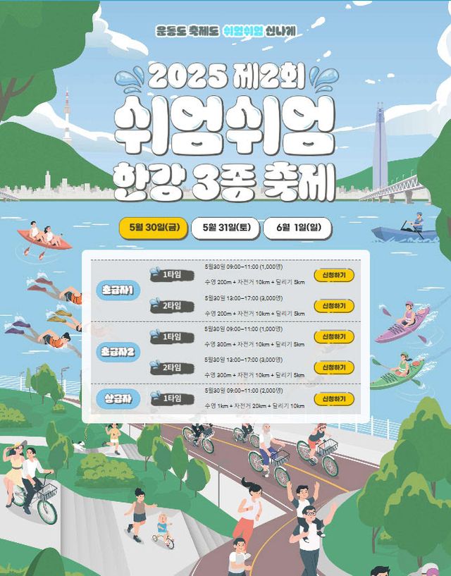 ‘쉬엄쉬엄 한강 3종 경기’ 2차 사전 신청은 오는 31일 오후 6시까지 실시한다. 본격적인 경기는 오는 5월 30일부터 6월 1일까지 뚝섬한강공원에서 진행한다. 자신의 체력 수준에 따라 3일 동안 나만의 속도와 방식으로 수영·자전거·달리기 3가지 종목을 완주하면 된다.