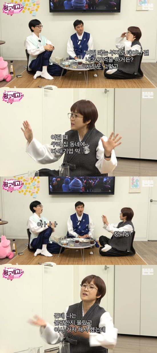 이에 유재석은 "은이가 가난했나?"라고 물었고, 송은이는 "나 가난했다 우리집. 엄마가 김밥 장사 새벽에 하셨다. 아빠가 보증 서가지고 망해가지고"라며 "어릴 때는 부자로 태어난 걸 내가 기억한다. 사진도 있고"라고 답했다.