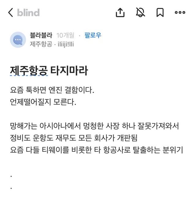 이와 함께 참사가 발생하기 훨씬 이전부터 기체 결함이 잦았다는 증언도 있었다. 지난해 2월 블라인드에 '제주항공 타지 마라'는 제목의 글을 올린 작성자는 "요즘 툭하면 엔진 결함이고, 언제 떨어질지 모른다"며 "사장 하나 잘못 데려와서 정비, 운항, 재무 모두 개판 됐다"고 강하게 비판했다.