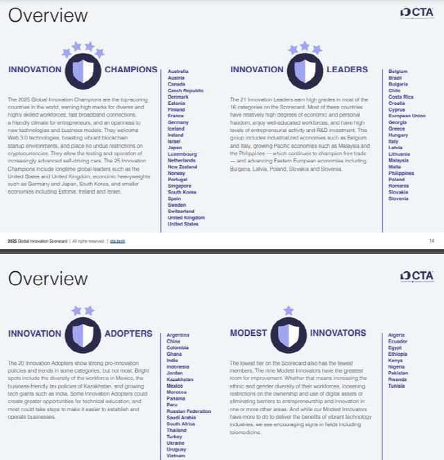 CTA는 올해 75개국 중 한국을 포함한 25개국을 최상위 그룹인 ‘이노베이션 챔피언스’로 평가했다. 한국은 지난해 두 번째 그룹인 ‘이노베이션 리더스’였으나 올해 한 단계 격상했다. 특히 기술무역과 정보교환, 중소·스타트업, 법적 환경, 디지털 투명성 등에서 좋은 평가를 받았다. 미국을 비롯해 프랑스, 독일, 일본, 싱가포르, 영국 등이 이 그룹에 들었다.