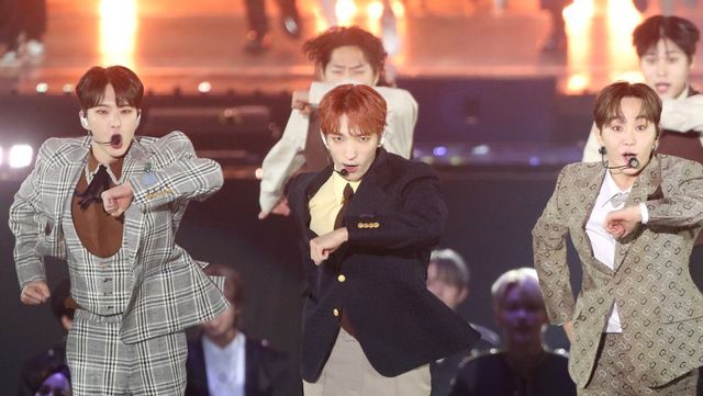 부석순 호시(왼쪽부터)와 도겸, 승관이 2023년 서울 송파구 올림픽공원 KSPO DOME에서 열린 ‘써클차트(CIRCLE CHART) 뮤직 어워즈 2022’에서 화려한 무대를 선보이고 있다. / 뉴스1