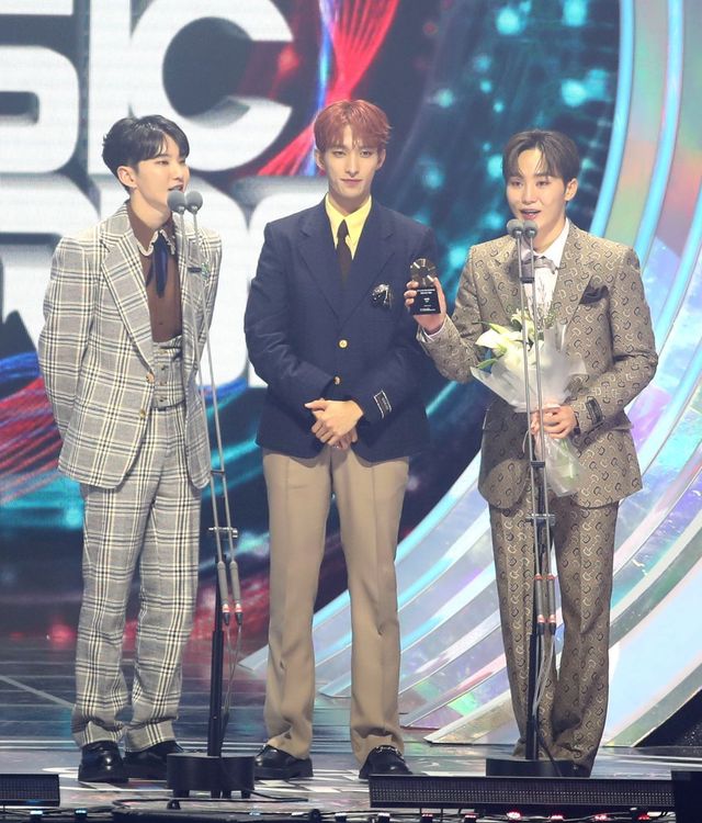 부석순 호시(왼쪽부터)와 도겸, 승관이 2023년 서울 송파구 올림픽공원 KSPO DOME에서 열린 ‘써클차트(CIRCLE CHART) 뮤직 어워즈 2022’에서 세븐틴으로 올해의 남자그룹상을 수상한 뒤 소감을 말하고 있다. / 뉴스1