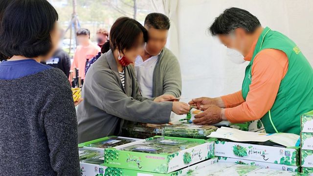 국내 한 휴게소 판매장에서 산나물 구매하는 관광객. 자료사진. / 뉴스1