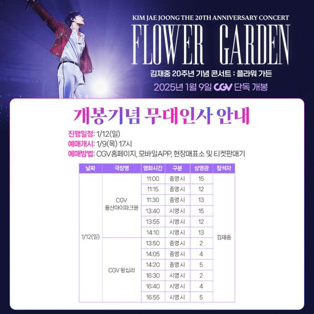 CJ CGV는 ‘김재중 20주년 기념 콘서트 : 플라워 가든’의 개봉을 하루 앞두고 베이비스(팬덤)를 위한 다채로운 이벤트를 예고했다.