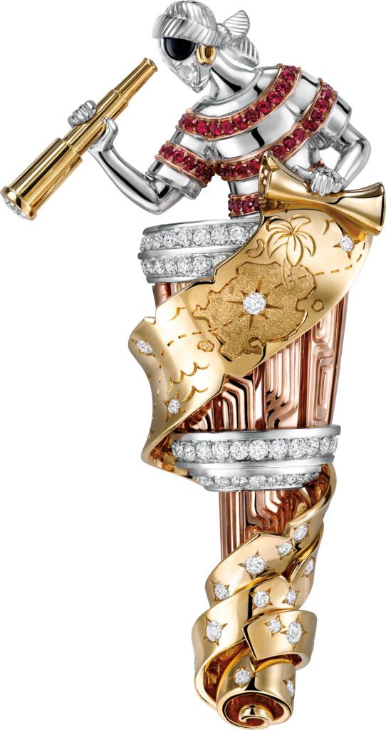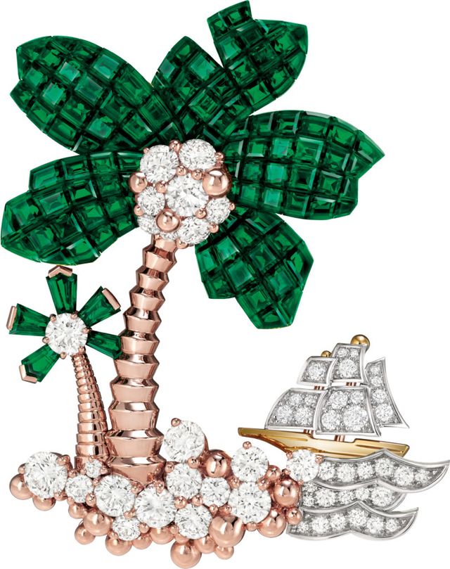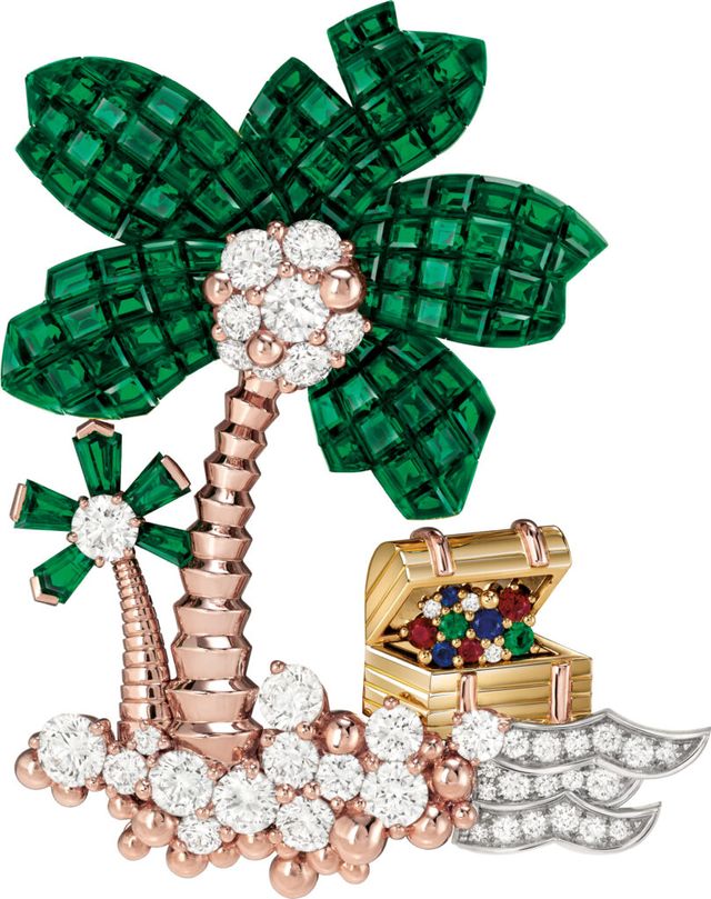 반클리프 아펠의 ‘트레저 아일랜드(Treasure Island)’ 하이 주얼리 컬렉션에는 무수한 매혹의 단서들이 존재한다. 지난 11월 마이애미에서 마주한 반클리프 아펠의 새로운 CEO 캐서린 레니에는 우아하면서도 강인한 어조로 새로운 하이 주얼리 컬렉션을 소개했다. 반클리프 아펠 메종은 그동안 여러 고전문학 작품에 경의를 표하며 하이 주얼리 컬렉션의 영감으로 삼았다. 윌리 엄 셰익스피어의 <한여름 밤의 꿈>과 <로미오와 줄리엣>, 그리고 쥘 베른의 <경이의 여행> 시 리즈가 그 예이다. 메종은 새로운 하이 주얼리 컬렉션을 위해 때로는 이야기 자체를 그대로 표 현하기도 하고, 때로는 스톤을 활용해 보다 다층적으로 접근한다. 예를 들어 <로미오와 줄리 엣>에서는 러브 스토리라는 주제를 창의적으로 다뤘는데, 하이 주얼리 컬렉션이 지닌 놀라움과 다양성을 담아내기 위해 오리지널 스토리에 신중하고 섬세하게 접근했다. 이러한 시도가 많은 상징성을 담고 있기에 스티븐슨의 원작을 읽지 않은 사람도 해적이나 보물 상자 같은 상징들을 통해 컬렉션의 가치를 느낄 수 있다. 해적의 안대, 외다리, 심장, 보물을 보여주고 보물 상자가 스톤으로 가득한 모습을 상상하는 것. 버려진 섬과 무성한 숲과 나무에 대한 상징이 바로 반클리프 아펠이 이러한 고전문학 작품을 다룰 수 있는 이유이기도 하다.