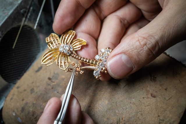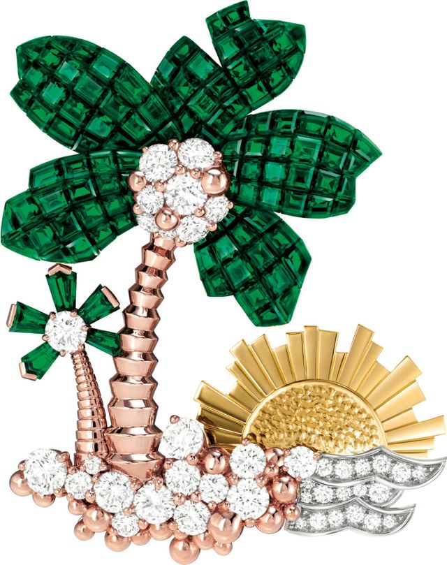 두 번째 챕터인 ‘섬의 탐험’은 메종에 상징적인 플로라와 파우나 컬렉션의 연장선이라고 설명할 수 있다. 동식물의 세계를 나비와 거북 같은 새로운 캐릭터로 확장 했으며, 거북을 주제로 한 클립은 골드와 스톤을 세팅해 눈길을 끈다. 또한 이 챕터는 열대 섬의 유혹적인 정취를 강렬하게 표현하며, 메종 고유의 ‘미스터리 세팅(Mystery Setting)’ 기법의 정점을 보여준다. 미스터리 세팅은 반클리프 아펠이 1930년대에 완벽하게 구현한 기술로 지금까지도 획기적인 하이 주얼리 기술력으로 인정받는다. 마치 스톤이 공중에 떠 있는 듯 정교하게 세팅하는 방식으로, 정교한 커팅으로 완성한 스톤이 레일 위에 하나씩 놓이며 완벽한 디자인을 이룬다. 이 챕터에서는 코키유 미스테리유즈 브레이슬릿의 미스터리 세팅과 팔미에 미스테리유 클립의 환상적인 미스터리 세팅을 감상할 수 있다. 특히 이 클립은 스토리를 충실히 표현한 작품으로 미스터리 세팅을 구현했을 뿐만 아니라 세 가지 방식으로 변형 가능한 주얼리라는 점이 특별함을 더한다. 각각 보트, 섬에서의 석양, 보물을 주제로 하며, 메종의 역사와 소설의 스토리를 넘어 이번 컬렉션의 모든 챕터에 경의를 표한다.