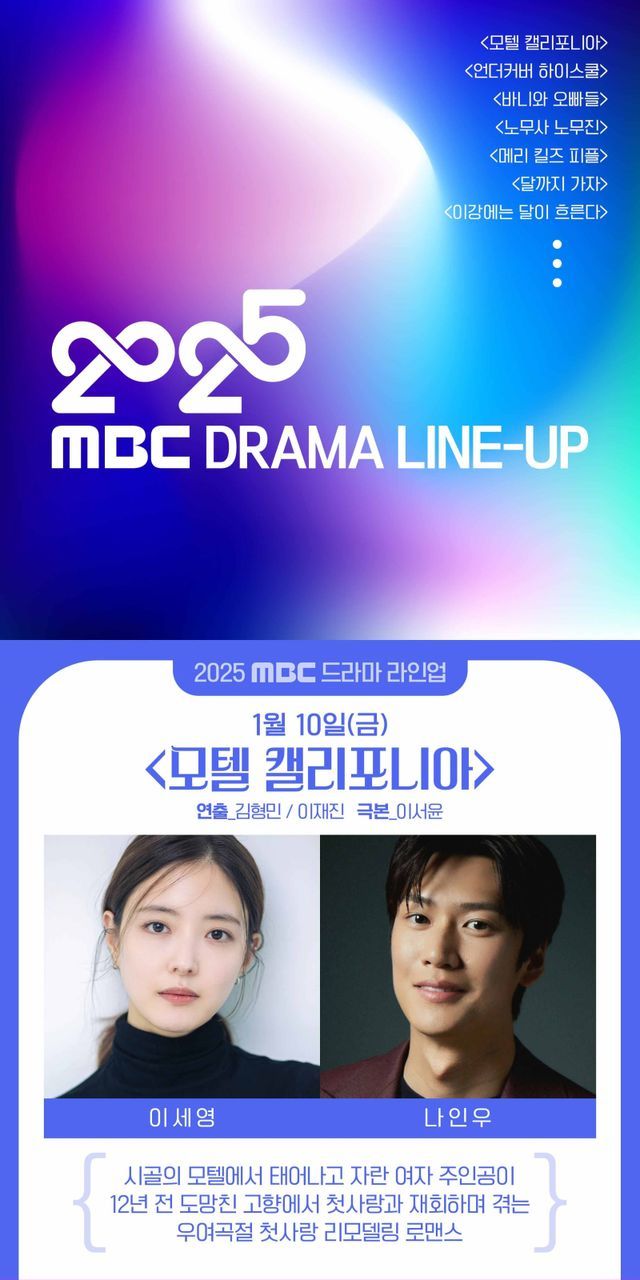 2025년을 열 첫 번째 MBC 드라마는 이세영, 나인우 주연의 ‘모텔 캘리포니아’이다. 시골의 모텔에서 태어나 모텔에서 자란 여자 주인공 ‘지강희’(이세영)가 12년 전 도망친 고향에서 첫사랑 ‘천연수’(나인우)와 재회하며 겪는 우여곡절 첫사랑 리모델링 로맨스로 오는 10일 첫 방송을 앞두고 있다.