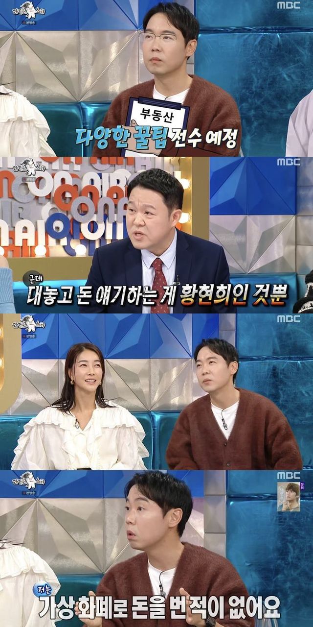 유세윤은 “섭외 이유가 100억 부자설 때문”이라고 하자, 황현희는 “개그맨 시절 월수입이 지금은 일을 안 해도 발생하는 시스템을 만들었다는 정도”라면서 “부동산 7, 주식 2, 현금과 가상화폐가 1 정도다. 자부할 수 있는 건 대출이 없다”라며 자산 보유 비율을 고백했다.