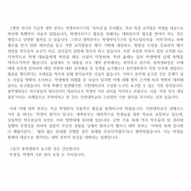 안녕하십니까, 가천대학교 제40대 총학생회장 조영학, 부총학생회장 송지원입니다. 먼저, 좋지 않은 소식으로 찾아뵙게 되어 학우분들께 진심 어린 사과를 드립니다. 본 성명문을 통해 가천대학교의 문제를 밝히고, 대학 본부에 대한 규탄과 함께 강력한 쇄신을 요구합니다.