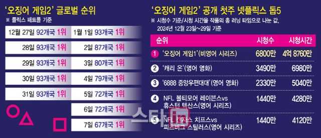 넷플릭스 톱10 공식 페이지 집계에 따르면 ‘오징어 게임2’는 공개 첫 주인 12월 넷째 주(23~29일) 4억 8760만 시청 시간을 기록했다. 공개 첫 주 기준으로 2021년 9월 넷째 주(20∼26일) ‘오징어 게임1’이 세운 4억4873만시간의 기록을 갈아치웠다. 전체 주간을 통털어도 ‘오징어 게임1’이 2021년 10월 첫째 주에 기록한 5억 7176만 시간에 이어 역대 2위에 달하는 놀라운 성적표다.
