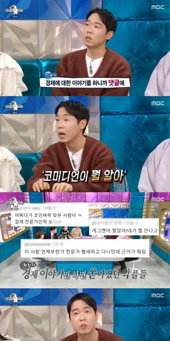 이날 황현희는 베스트셀러였던 첫 번째 책 출간 이후 두 번째 책을 출간했다고 말했다. 그러면서 "책 출간 후에 예능 보다는 경제 채널에 많이 출연했다. 그런데 제가 경제 이야기를 하면 '개그맨이 뭘 안다고 떠드냐'는 댓글이 많이 달린다"고 했다.