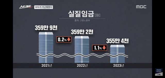 물가를 감안한 실질임금은 평균 355만 4천원으로 1년 전보다 오히려 1.1% 줄었습니다.