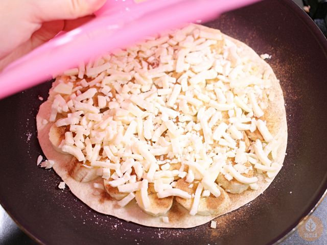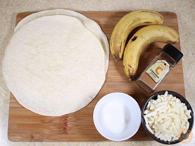 재료는 바나나, 또띠아, 모짜렐라치즈, 설탕, 시나몬가루 준비해요.