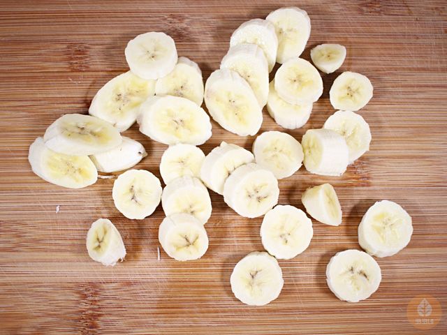 바나나 껍질을 까서 일정한 두께로 썰어주세요.