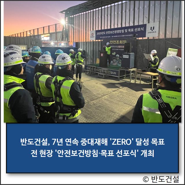 이를 위해 반도건설은 전국 15개 반도유보라 아파트 공사현장 및 공공 공사현장 에서 동시에'2025년 안전보건방침 및 목표 선포식'을 개최하고 전사적인 안전보건문화 정착을 통해 재해없는 현장 만들기에 나섰다.
