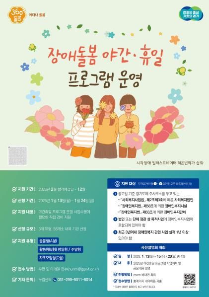 [파이낸셜경제=김영란 기자] 경기도는 대표 복지정책인 ‘경기 360° 돌봄’의 하나로 야간․휴일에도 장애인과 그 가족을 대상으로 돌봄프로그램을 제공하는 ‘360° 어디나 돌봄 장애돌봄 야간․휴일 프로그램’사업 운영기관을 1월 13일부터 24일까지 모집한다.