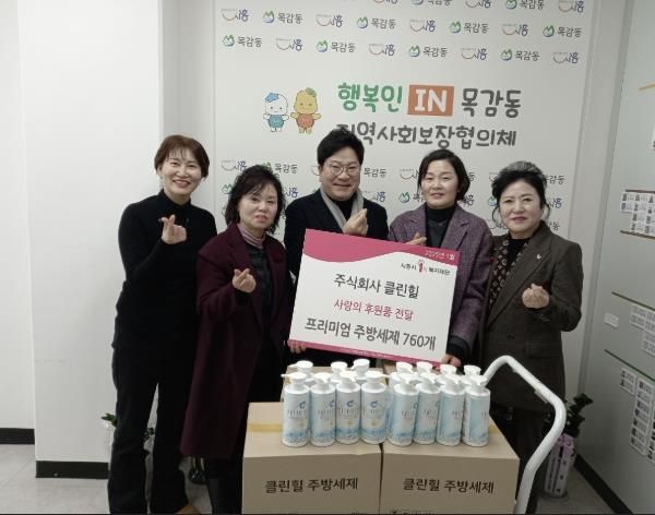 이명옥 목감동장과 이순이 지역사회보장협의체 민간위원장은 “이처럼 통 큰 기부로 더 많은 이에게 나눔의 손길을 전할 수 있게 돼 매우 뜻깊다”라며, “기부해 준 친환경 주방세제는 취약계층에 전달해 환경과 사회를 함께 생각하는 의미 있는 나눔이 될 수 있도록 하겠다”라고 말했다.