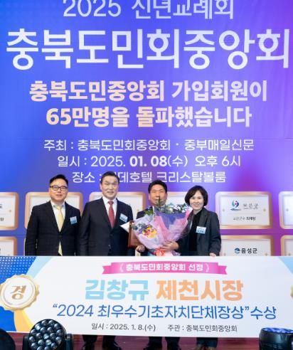 [파이낸셜경제=김영란 기자] 김창규 제천시장이 지난 8일 서울 롯데호텔에서 개최된 ‘2025충북도민회중앙회 신년교례회’에서 ‘최고 자치단체장’ 대상을 받았다.