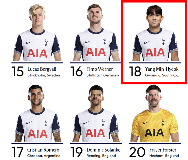 토트넘 구단에 따르면 양민혁은 유니폼 뒷면애 '민혁(min-hyeok)'이라는 이름을 표기할 예정이다. 손흥민이 성인 '손(son)'으로만 표기한 것과는 다르다.