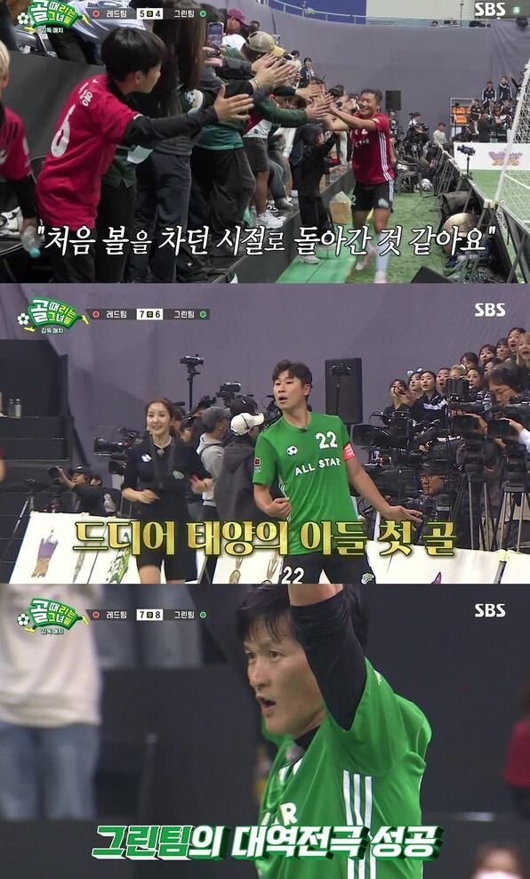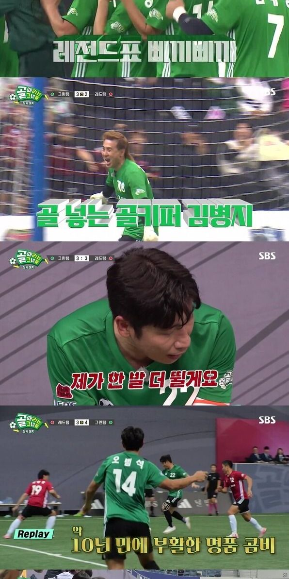 이후 레전드들의 화려한 기술 플레이가 이어졌다. 이영표는 센스 넘치는 뒷발슛으로 레전드 클래스를 과시했고, ‘골 넣는 골키퍼’ 김병지는 필드를 가로지르는 시원한 슈팅으로 역전골을 만들어냈다. 특히 그린팀은 감독 김승혜를 필두로 로제의 ‘아파트’부터 ‘삐끼삐끼’ 댄스까지 다채로운 세리머니를 선보여 관객들의 웃음을 자아냈다.