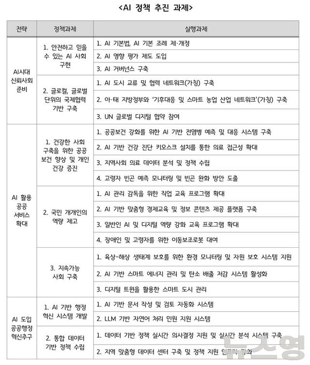 이에 연구원은 AI 일상화 시대의 정책 목표로 ▲‘다양한 개인의 삶이 존중되는 건강 사회 구현’과 ▲‘모두의 디지털 접근성이 보장되는 디지털 포용 사회 구현’을 제시하였으며, 이를 위해 3대 추진전략(▲AI 시대 신뢰 사회 준비 ▲AI 활용 공공 서비스 확대 ▲AI 도입 공공 행정 혁신 추구) 및 7개 정책과제에 따른 21개 실행 과제를 제안했다.