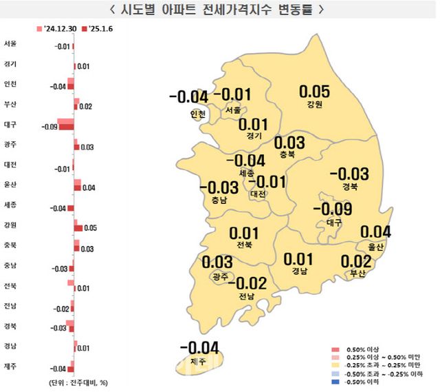 그 외 5대광역시(-0.01%→-0.01%)는 하락폭 유지, 세종(0.00%→-0.04%)은 보합에서 하락 전환, 8개도(-0.01%→0.00%)도 하락에서 보합으로 전환했다.