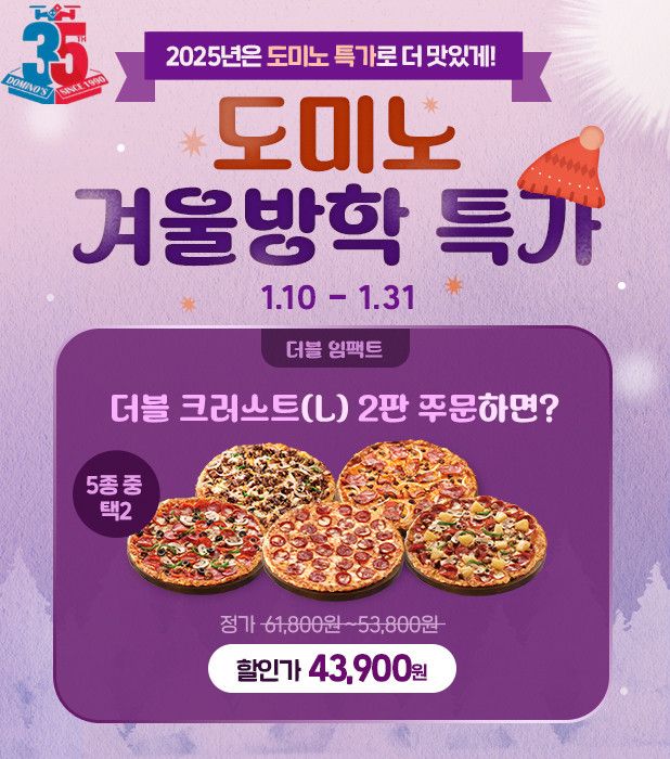 이번 '겨울방학 특가'에서 가장 관심을 끄는 세트는 도미노피자 35주년을 기념해 출시한 '더블 임팩트' 세트로 다섯가지 메뉴 중 두가지 메뉴를 선택할 수 있다. 이 외에도 프리미엄 피자 4종(△베스트 콰트로 △블랙타이거슈림프 △와일드와일드웨스트 △K-쌈장 채끝 스테이크) 중 한 개 제품과 치즈피자(M)를 배달 주문 시 3만9900원에 맛볼 수 있는 '다이닝 파티팩'은 많은 사람들과 함께 모여서 풍성하게 즐길 수 있다.
