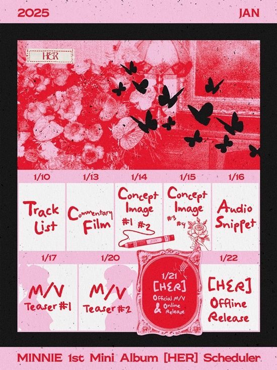 소속사 큐브엔터테인먼트는 9일 공식 채널을 통해 민니 첫 번째 솔로 미니 앨범 'HER'의 스케줄 티저를 공개했다. 이번 티저는 앞서 강렬했던 커밍순 티저 영상과 상반된 레드, 핑크 컬러의 사랑스러운 무드로 시선을 모았다.