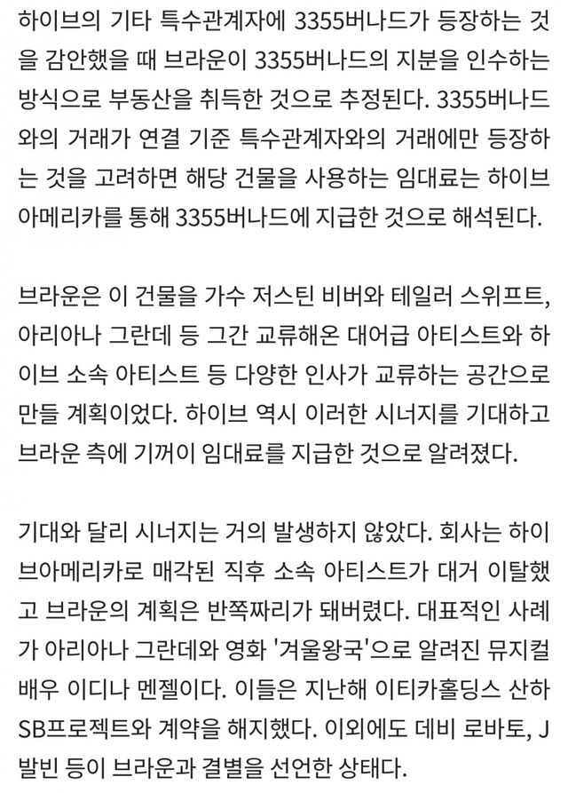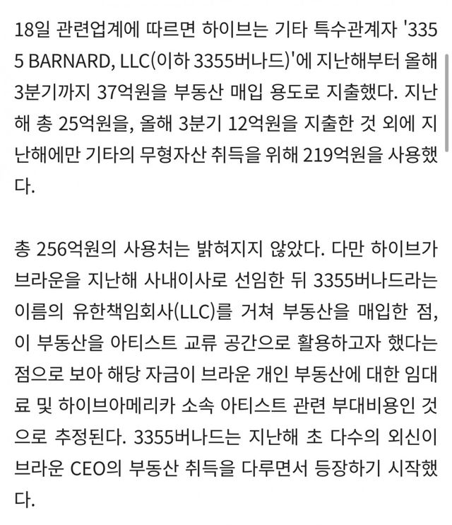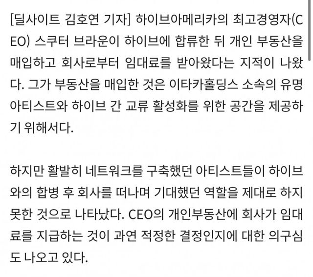 하이브, CEO 소유 부동산에 임대료 지급 ‘논란’